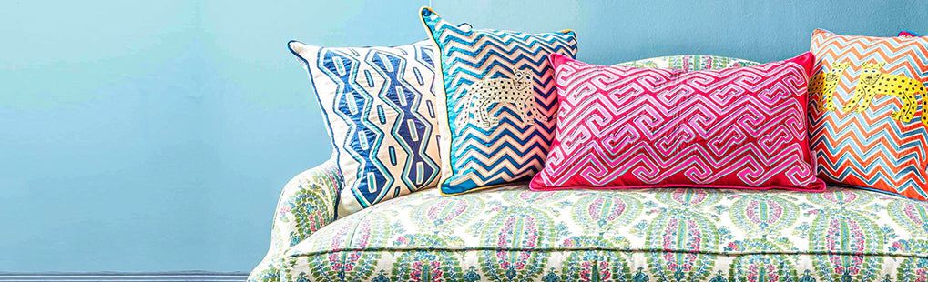 All the Kuna Textiles are made in Colombia in the Caiman Alto Reserve by the Guna Dule community who for generations have passed down an ancient appliqué technique of hand sewing cut-out layers of fabrics to form an intricate piece of art. Then the Kuna Textiles are brought to England, where they are crafted into cushions which are backed with Wicklewood’s statement fabrics and signature contrasting trim.
