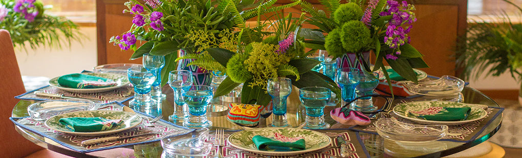The large floral arrangements are reminiscent of the Darien Jungle where the Guna Dule artisans of Colombia live. The color accents add texture and work beautifully with our Kuna placemats. As always at Mola Sasa we like to tell stories in everything we do!