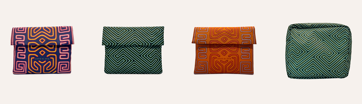 Together, we’ve developed four distinctive pouch designs, some sleek and flat, others with sculptural forms, crafted to hold curated product kits sold exclusively by Loto del Sur. These pouches go beyond packaging: they are vessels of culture, infused with vibrant prints inspired by traditional Gunadule textiles.